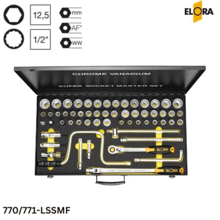 Bộ tuýp ELORA 770/771-LSSMF – 57 chi tiết là bộ dụng cụ cao cấp được thiết kế chuyên biệt cho các công việc sửa chữa và bảo trì cơ khí chuyên nghiệp. Với sự kết hợp giữa hệ mét và inch, bộ sản phẩm này đáp ứng linh hoạt nhiều tiêu chuẩn công nghiệp khác nhau.