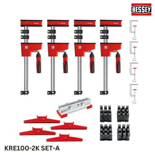 Bộ cảo BESSEY KRE100-2K SET-A bao gồm 4 cảo K-body hành trình 1000mm, kèm theo đầy đủ phụ kiện hỗ trợ như tay đỡ, bộ nối ray, kẹp đỡ khung. Thiết kế chuyên dùng cho lắp ráp, cố định khung gỗ, nội thất và ứng dụng chính xác trong công nghiệp. Sản xuất tại Đức.