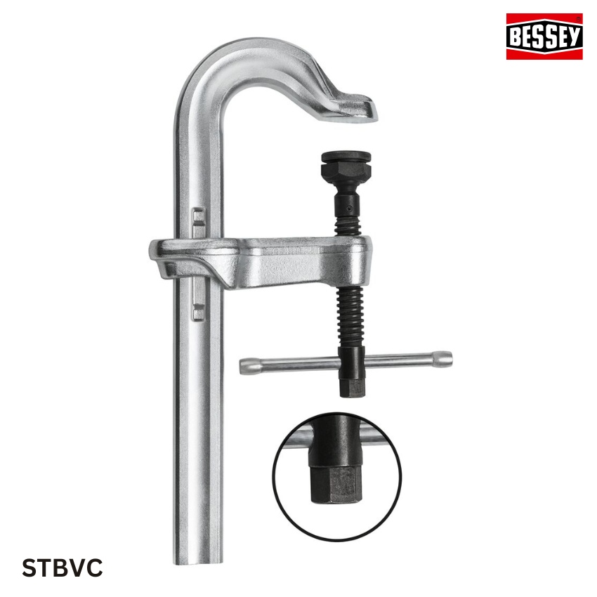BESSEY STBVC là dòng cảo hiệu suất cao chuyên dụng cho các tác vụ cần lực kẹp cực mạnh, đạt đến 35.000N. Trục vít được thiết kế đầu lục giác 19mm cho phép siết bằng dụng cụ cơ khí hoặc máy siết. Tấm ép chịu nhiệt có thể nghiêng tới 35°, đảm bảo độ bền và linh hoạt khi kẹp phôi có bề mặt nghiêng. Thiết kế chắc chắn, tối ưu cho môi trường hàn kết cấu và gia công kim loại nặng.