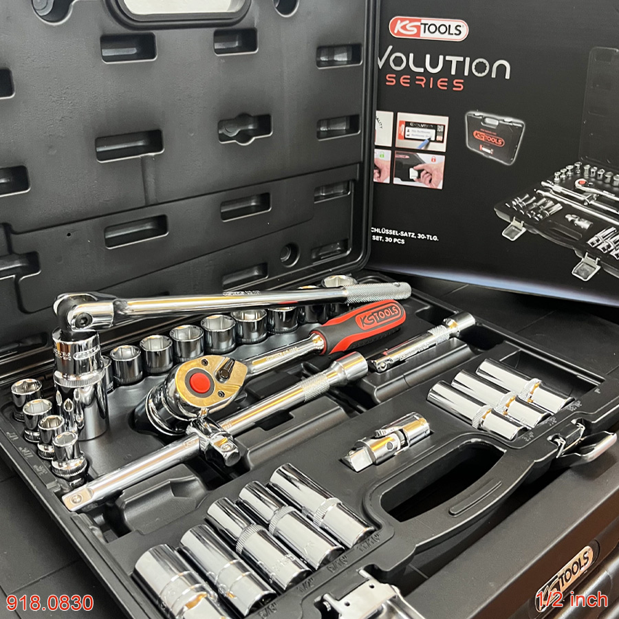 CHROMEplus Bộ khẩu tay vặn 30 pcs 1/2 inch KS Tools 918.0830 bao gồm các đầu khẩu, tay văn hệ inch dùng để sửa chữa, bảo trì các thiết bị máy của Mỹ – EU. Chính hãng KS Tools Germany