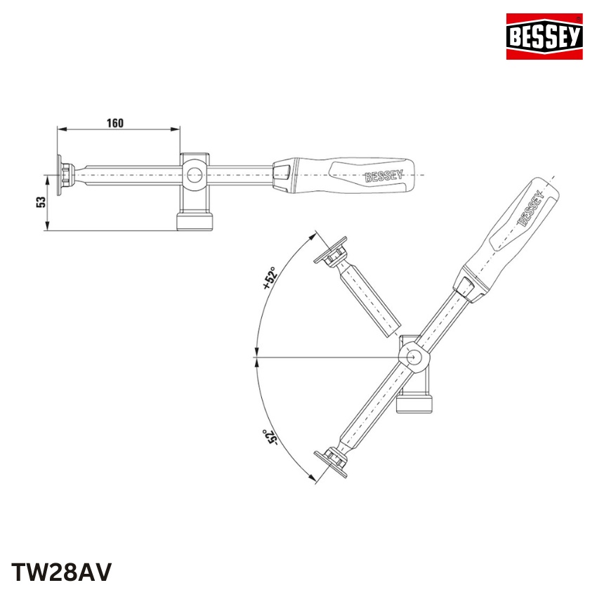 BESSEY TW28AV là phụ kiện kẹp nghiêng chuyên dụng cho hệ thanh trượt TW28X, lực kẹp lên đến 3000 N. Cho phép điều chỉnh góc nghiêng liên tục từ -52° đến +52°, khóa cố định bằng đai ốc thang chắc chắn. Tay cầm nhựa hai thành phần, trục ren dài phù hợp bàn hàn dạng lỗ tiêu chuẩn 28 mm.