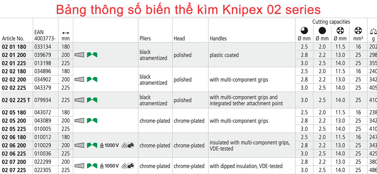 Bảng thông số kìm đầu bằng đa năng Knipex 02 Series