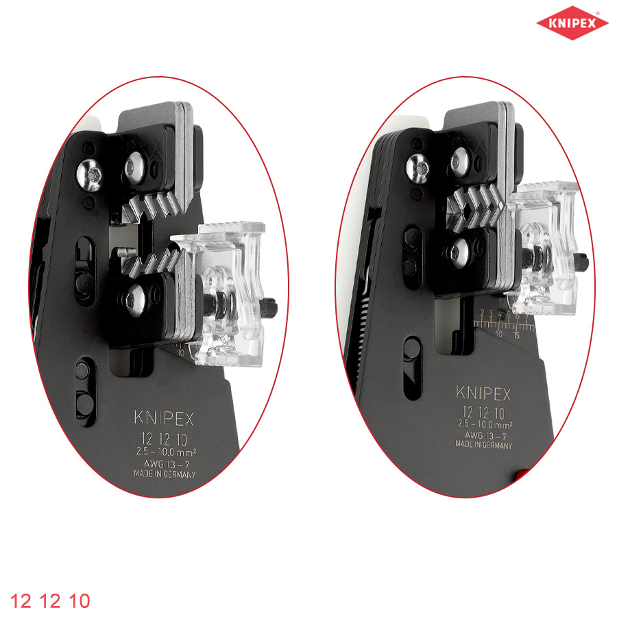 Knipex 12 12 10: Kìm tuốt dây điện vỏ cứng 2.5 – 10 mm² chuyên dùng tuốt lớp cách điện đặc biệt cứng như PTFE, silicone, Radox® và cao su đa lớp. Thiết kế có thể thay lưỡi dễ dàng và dải tuốt rộng từ 2.5 đến 10 mm², đặc biệt thích hợp cho các ứng dụng công nghiệp yêu cầu tuốt nhanh và chính xác. Made in Germany