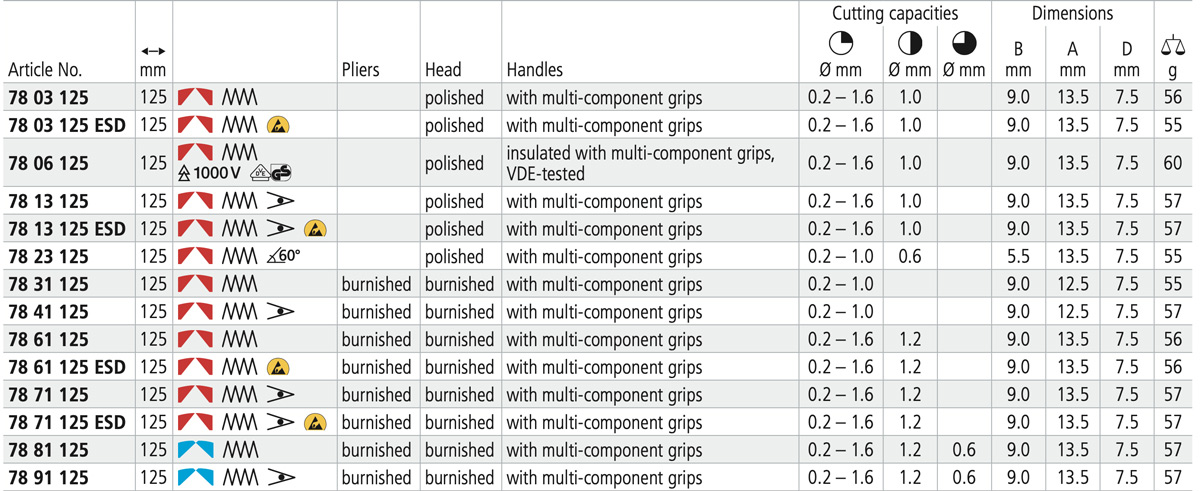 Knipex 78 Series là dòng kìm cắt linh kiện chính xác gồm có 14 biến thể. Khác nhau ở thiết kế đầu mũi kìm, kiểu mạ kìm, bề mặt kìm và đặc biệt các mã kết thúc = “ESD” là dòng chống tĩnh điện. Khả năng cắt dây thép mềm từ 0,2 – 1,6 mm. Các kích cỡ giống hết nhau là 125 mm. Chi tiết xem bảng mô tả dưới
