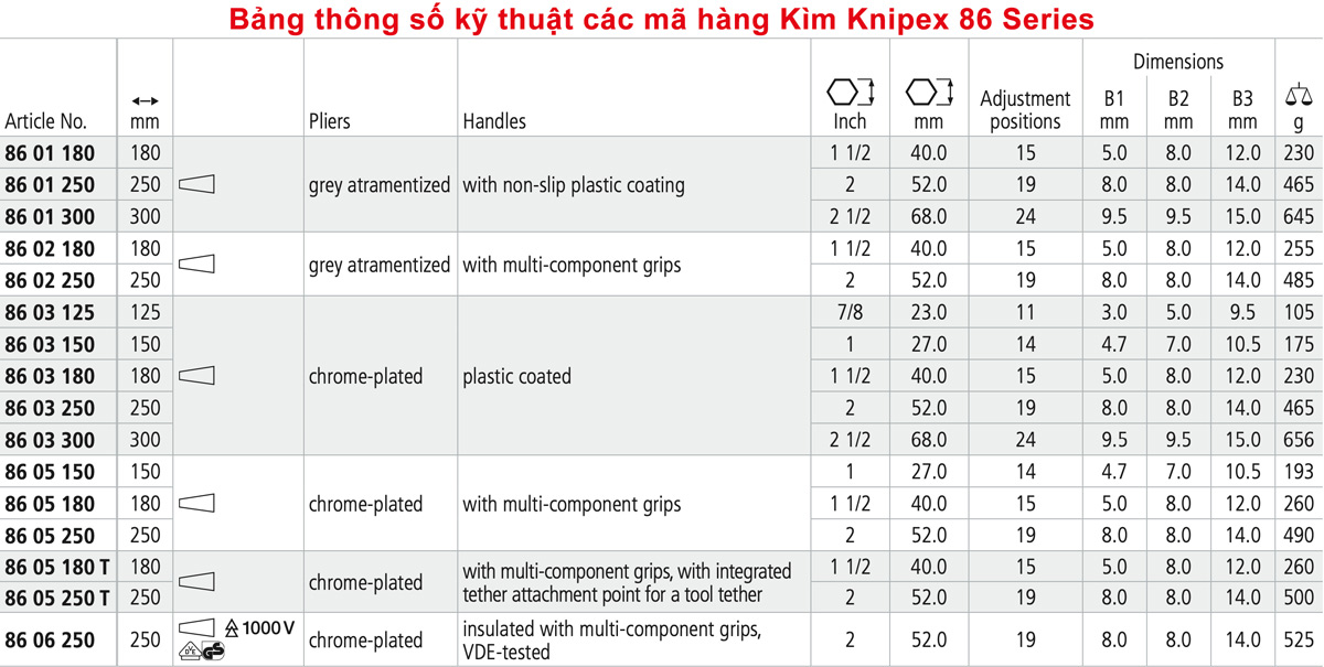 Bảng thông số kỹ thuật các biến thể Knipex 86 Series
