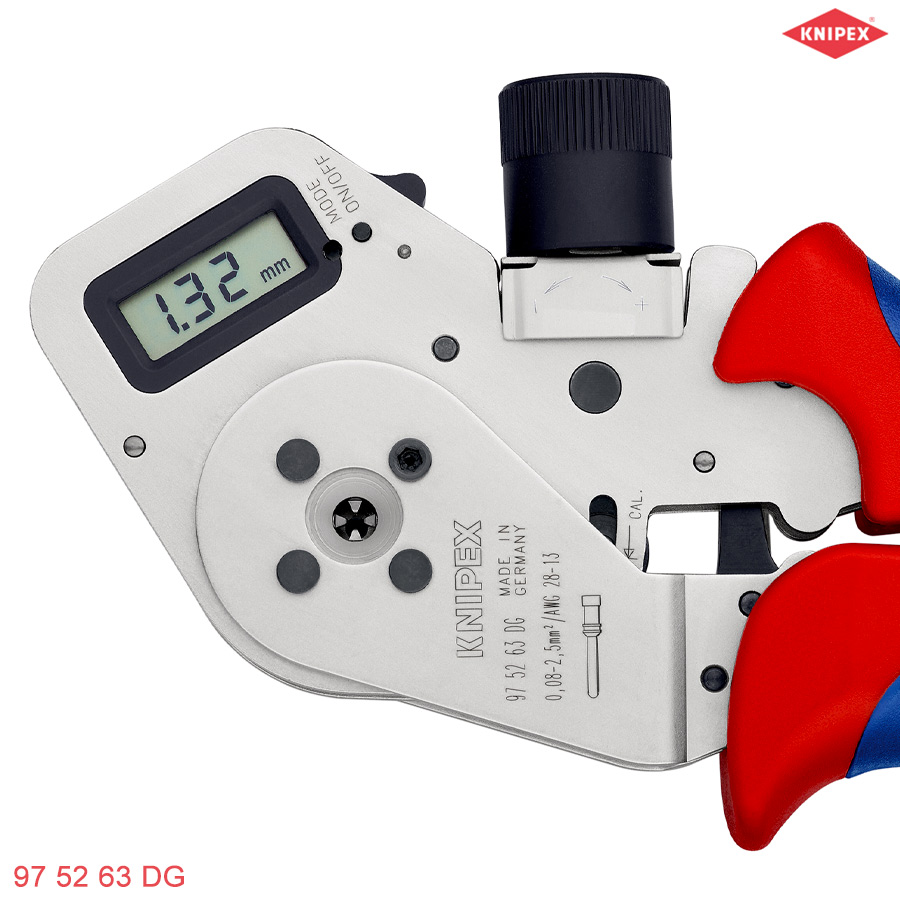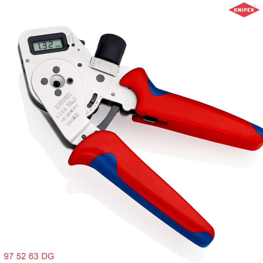 Kìm bấm cos kim Kniepx 97 52 63 DG dùng bấm cos Turned contact 0.08 – 2.5 mm², màn hình hiện số. Đảm bảo mối bấm lặp lại, yêu cầu chính xác cao như các đầu connector của Phoenix Contact (Coninvers). Made in Germany