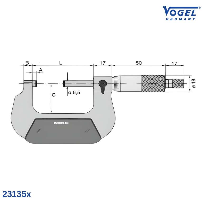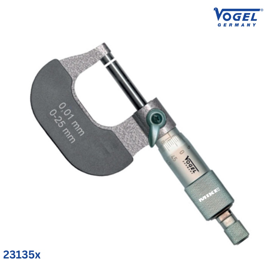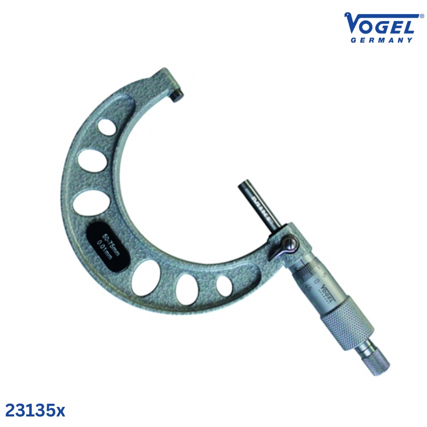 Dòng panme cơ Vogel Germany 23135x được thiết kế đáp ứng tiêu chuẩn đo lường DIN 863, phù hợp cho các yêu cầu đo ngoài thông dụng trong gia công cơ khí. Tang trống và ống chuẩn phủ chrome mờ chống chói, khung sơn búa xám đi kèm tay cầm cách nhiệt, đảm bảo độ ổn định khi thao tác. Các bề mặt đo carbide được mài và tôi cứng, trục quay gia công chính xác cho độ bền cao.
