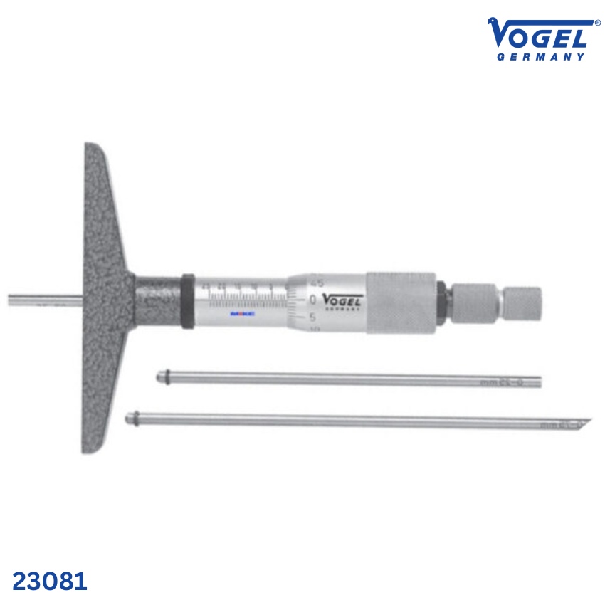 Dòng panme Vogel Germany 23081 có thiết kế đế đo phẳng bằng thép, bề mặt được mài và đánh bóng tinh, giúp nâng cao độ chính xác khi đo chiều sâu lỗ, rãnh hoặc khe hẹp. Các kim đo được chế tạo từ thép hợp kim, tôi cứng và mài nhẵn, có thể thay thế linh hoạt để đáp ứng nhiều dải đo khác nhau.