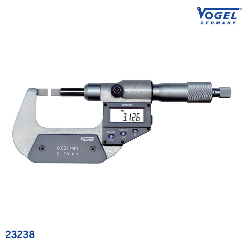 Panme điện tử Vogel 23238 được thiết kế chuyên dụng để đo các rãnh nhỏ, khe hẹp và biên dạng đặc biệt trên chi tiết cơ khí. Dụng cụ đạt chuẩn DIN 863, trang bị màn hình LCD lớn (cao ký tự 7mm) hiển thị rõ ràng, dễ đọc. Thiết kế theo chuẩn IP40, có khả năng chống bụi theo tiêu chuẩn DIN 40050 / IEC 60529, phù hợp cho môi trường xưởng cơ khí và kiểm tra sản xuất.