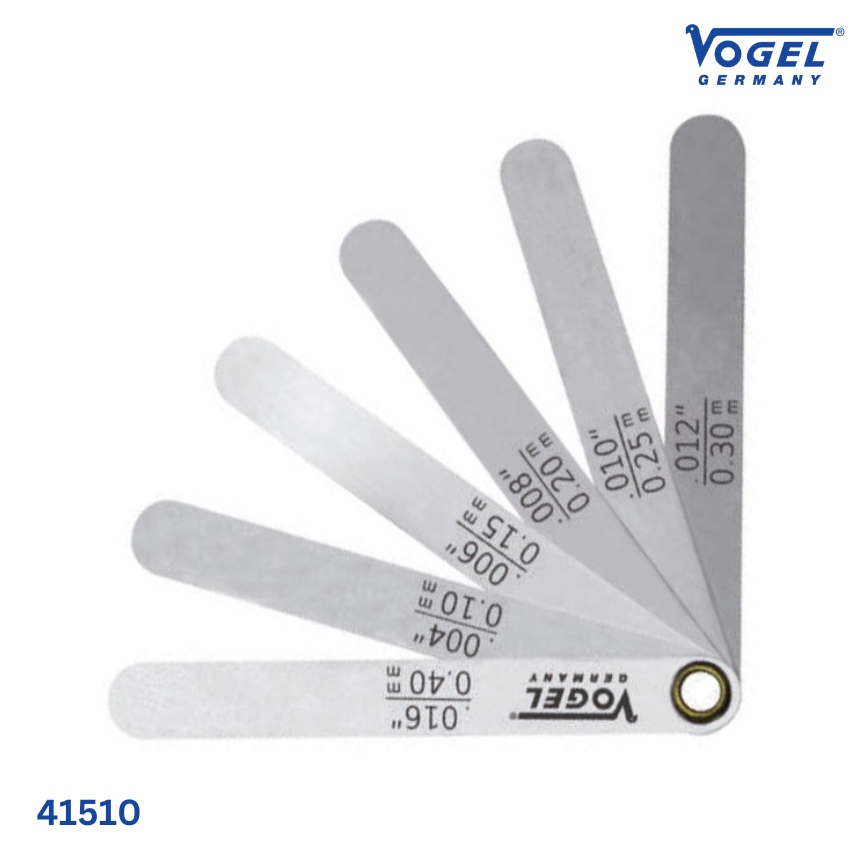 Thước căn lá Vogel 41510 là dụng cụ đo khe hở chuyên dùng cho việc điều chỉnh khe hở xupap (valve) trong động cơ. Các lá được chế tạo từ thép lò xo tôi cứng, có chiều dài 75mm, bản rộng 9mm, đầu lá dạng trụ tròn. Bộ lá được ghim cố định bằng đinh tán đồng thau, bền chắc và dễ dàng thao tác. Trên từng lá được khắc rõ kích thước theo mm và inch, đáp ứng tiêu chuẩn dung sai T2 với độ chính xác cao.