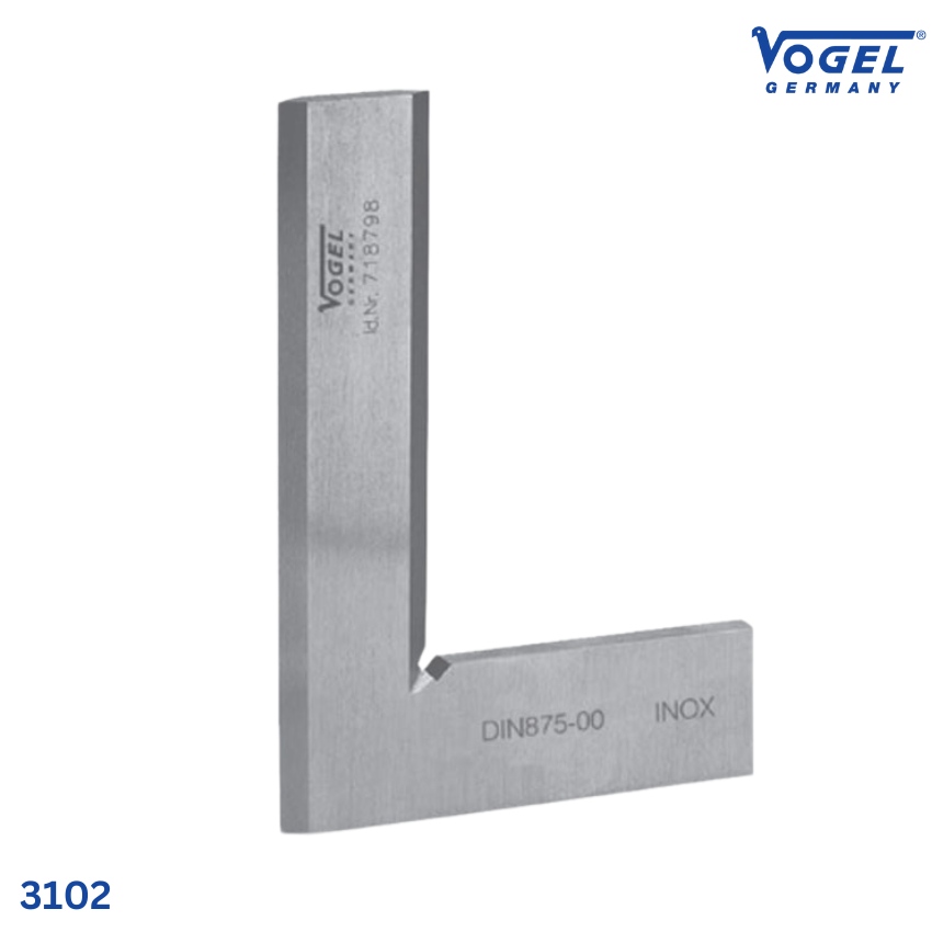 Thước vuông mép vát Vogel Germany 3102 được chế tạo từ thép không gỉ, đạt chuẩn DIN 875/00, ứng dụng kiểm tra độ vuông bằng phương pháp soi khe sáng (light-gap method). Sản phẩm có hai dạng: thước phẳng và thước có gờ, với mép thước được vát, mài mịn và lapped để đạt độ chính xác cao.