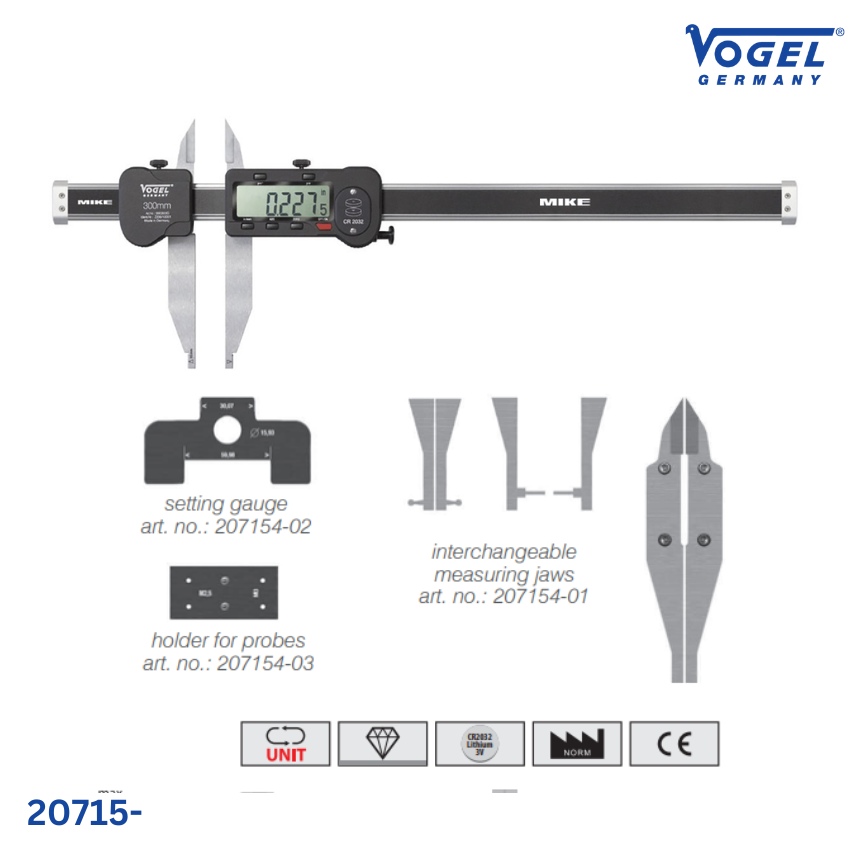 Ngoài ra, Vogel cung cấp các phụ kiện tùy chọn như: cặp hàm đo thay thế dài 90 mm (M2.5), dưỡng chuẩn (setting gauge) và giá giữ đầu dò, giúp mở rộng khả năng ứng dụng trong đo kiểm chính xác. Thước thích hợp cho xưởng gia công cơ khí, nhà máy chế tạo khuôn mẫu và phòng QC.