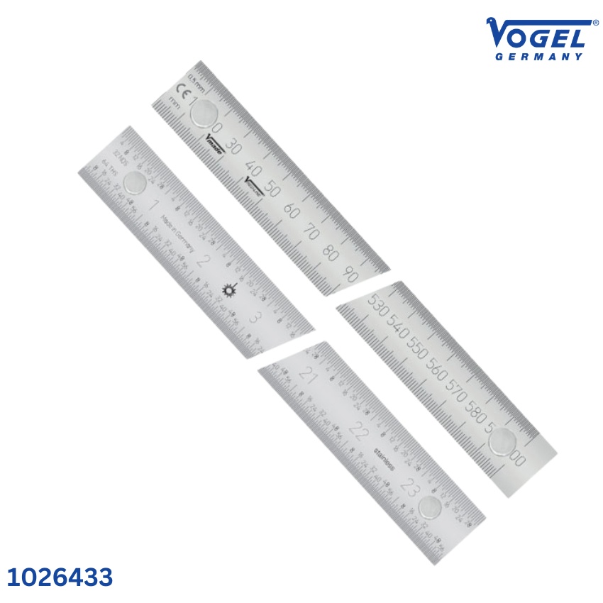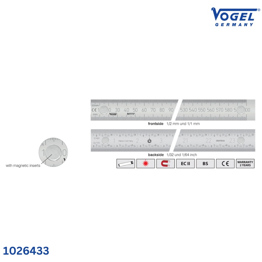 Thước lá Vogel Germany 1026433 chế tạo từ thép không gỉ, bề mặt mờ chống lóa, vạch chia khắc laser chính xác, hiển thị cả mm và inch ở hai mặt. Trang bị miếng từ tính tháo lắp nhanh, hỗ trợ đo cố định trên bề mặt kim loại trong công việc cơ khí và lắp ráp.