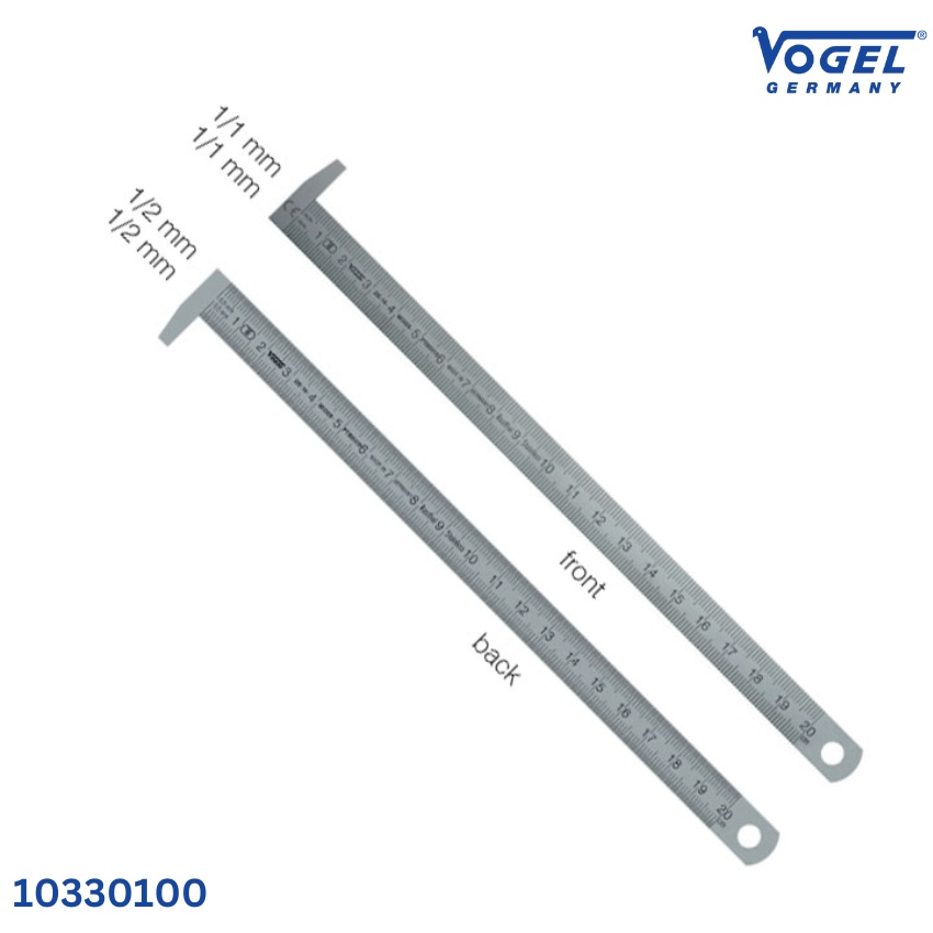 Thước lá inox Vogel Germany 10330100 với ngàm móc 90°, đọc từ trái sang phải, vạch chia khắc laser rõ nét trên cả hai mặt. Chế tạo từ thép lò xo không gỉ, bề mặt mờ chống lóa, cấp chính xác Class II. Thích hợp đo cạnh, lấy dấu và kiểm tra kích thước nhanh trong cơ khí.