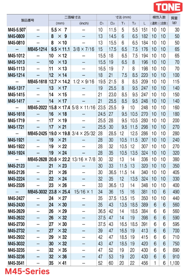 Dòng M45 của TONE được chế tạo từ thép hợp kim chịu lực cường độ cao, đảm bảo độ bền cơ học và khả năng chịu mô-men xoắn lớn trong các ứng dụng công nghiệp nặng, bảo trì máy móc và lắp ráp ô tô. Thiết kế thân cờ lê dạng dài giúp tối ưu hóa lực siết, giảm thiểu sức lao động cho người sử dụng khi đối mặt với các mối nối cứng hoặc bị rỉ sét.
