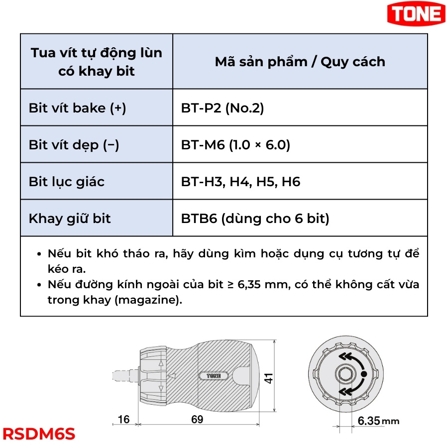 - Tay vặn: RSDM – Tay vặn vít tự động dạng lùn, đầu gắn bit 6.35 mm