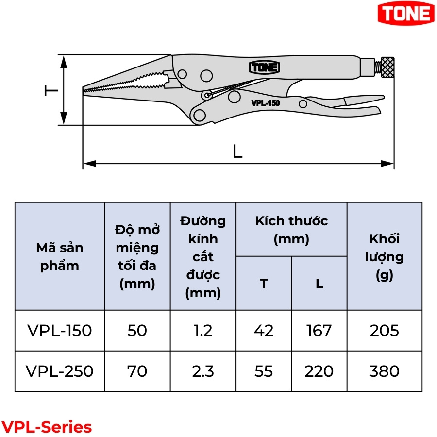 Dòng kìm bấm chết mũi dài TONE VPL-Series (Long Nose Type – gồm các model VPL-150 và VPL-250) là dụng cụ kẹp giữ chuyên dụng được thiết kế với hàm kẹp thanh mảnh và kéo dài. Sản phẩm kết hợp hoàn hảo giữa khả năng tiếp cận sâu của kìm nhọn và lực khóa mạnh mẽ của kìm bấm chết, cực kỳ hiệu quả khi cần kẹp giữ, cố định hoặc tháo xoắn các chi tiết nằm trong hốc sâu, khe hẹp. Unicom JSC là nhà phân phối TONE Japan.
