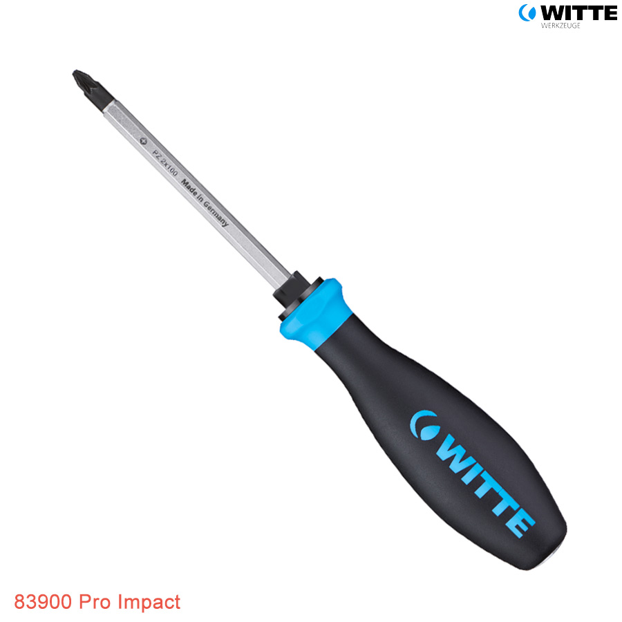 WITTE 83900 – Tô vít đóng mũi bake (PH) thân lục giác thuộc dòng Pro Impact của WITTE Germany, được sản xuất 100% tại CHLB Đức và thiết kế cho những tác vụ vặn lực lớn hoặc dùng búa đóng trong sửa chữa cơ khí, thợ máy, gara với độ bền và khả năng chịu lực vượt trội